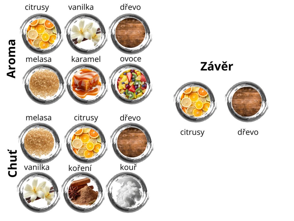 Chuť: Citrusová svěžest, dřevo, melasa, vanilka, jemný kouř a koření.