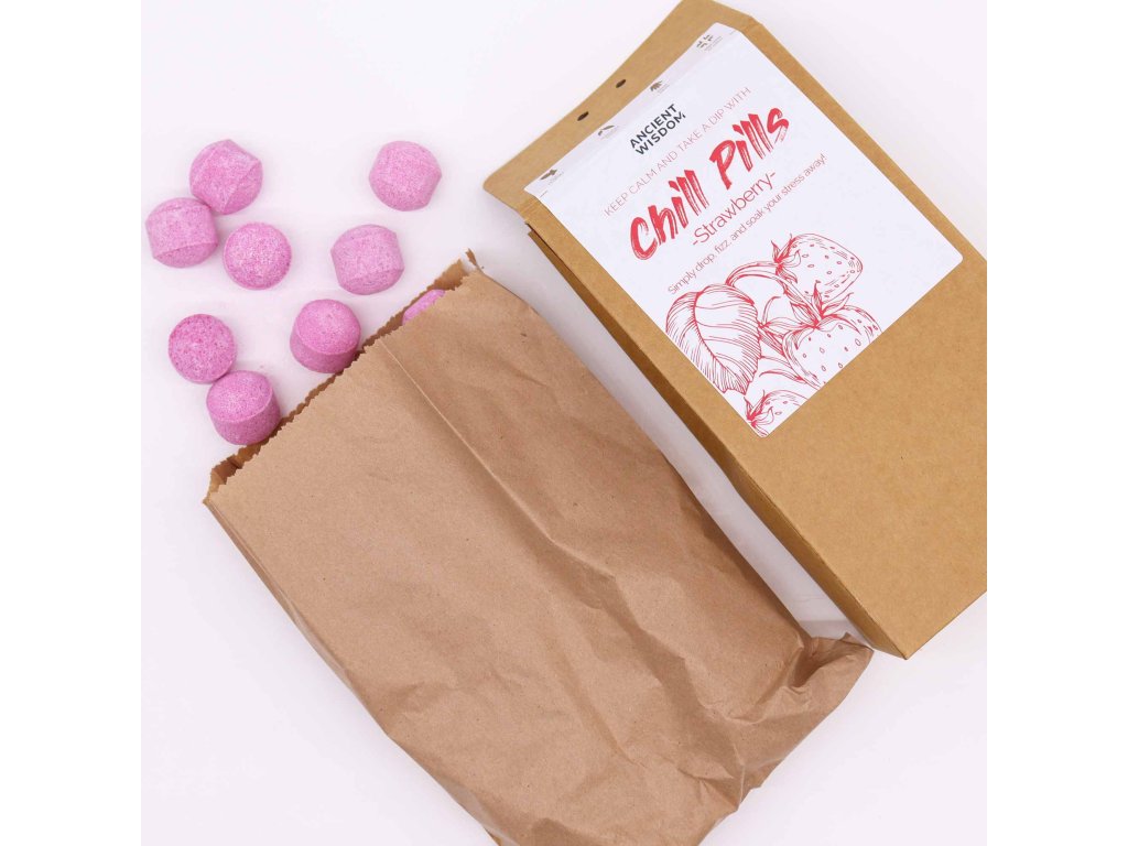 Představte si slunečný den na jahodové farmě, kdy sladká vůně čerstvých jahod prostupuje vzduchem a vše kolem vás se naplní radostí. Přesně takovou atmosféru přináší do vaší koupelny šumivé kuličky Chill Pills Strawberry od Ancient Wisdom.