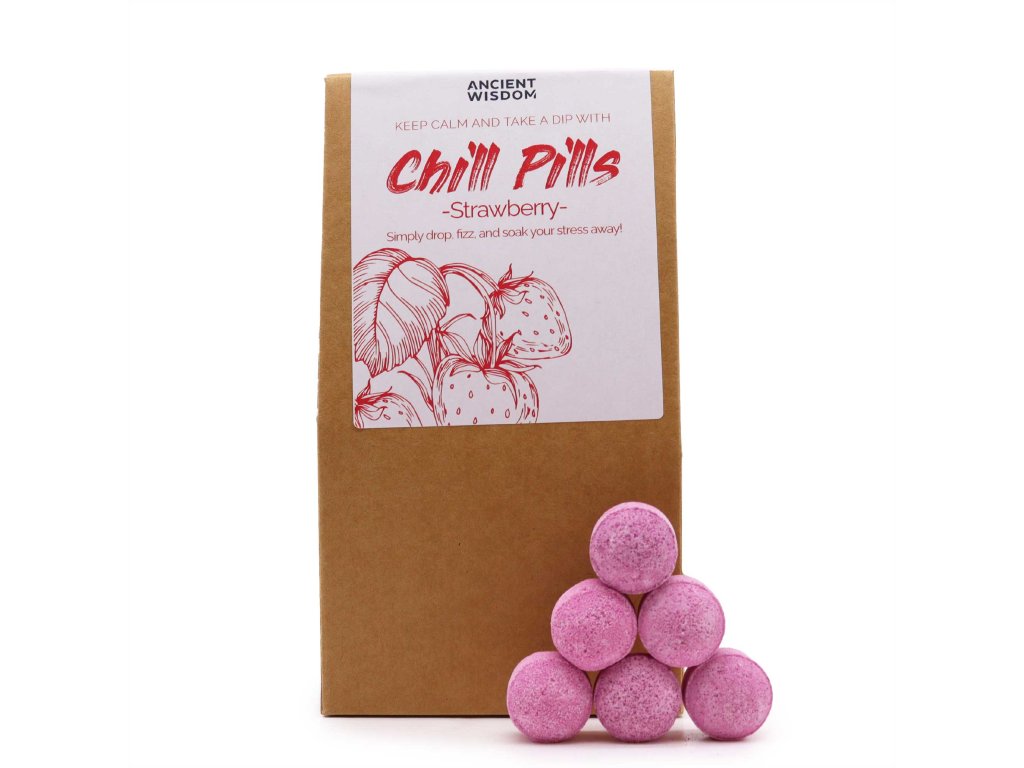 Chill Pills Strawberry: šumivé kuličky do koupele se sladkou vůní jahod pro radost, relaxaci a pocit bezstarostného štěstí.