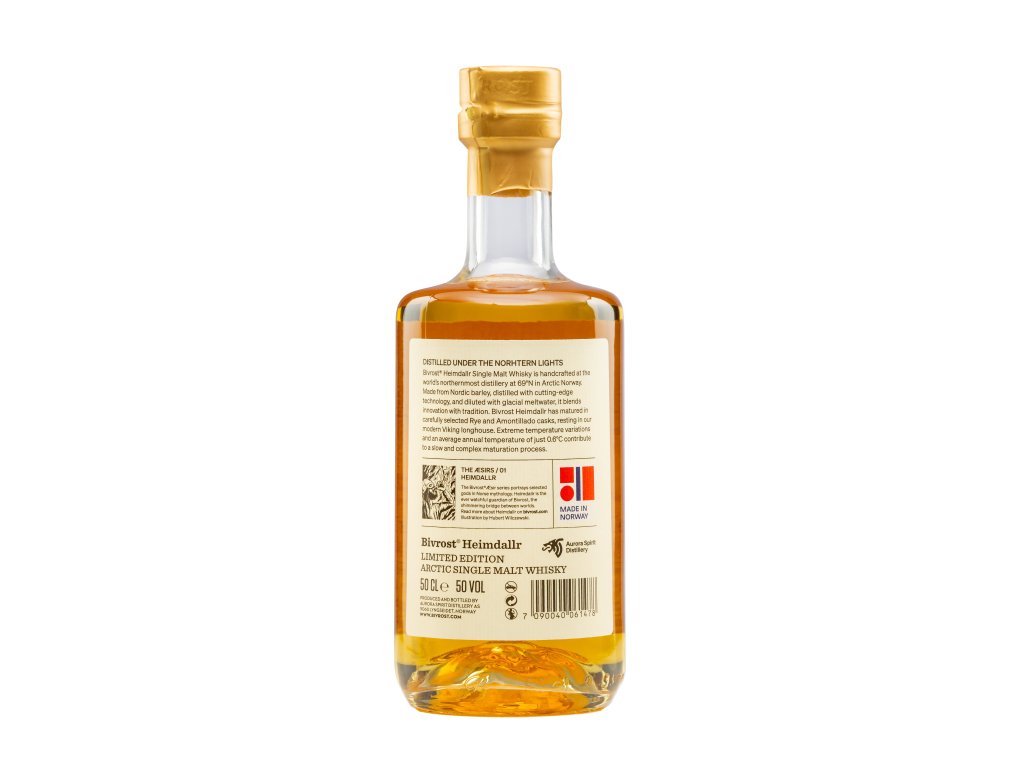 Bivrost Heimdallr je arktická Single Malt whisky z nejseverněji položené palírny světa Aurora Spirit Distillery v norské divočině, na 69° severní šířky. Mezi Lyngenskými Alpami, fjordem a arktickou krajinou za polárním kruhem vzniká prostředí, které se do whisky otiskuje jedinečnou čistotou, hloubkou a charakterem.