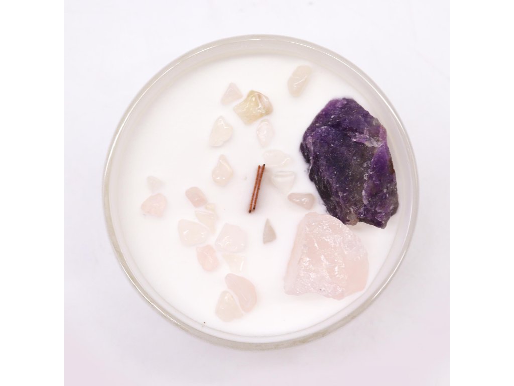 Chakra Crystal Candle Third Eye Chakra: sójová svíčka s ametystem a růžovým křemenem pro podporu intuice, duchovní jasnosti a vnitřní moudrosti.