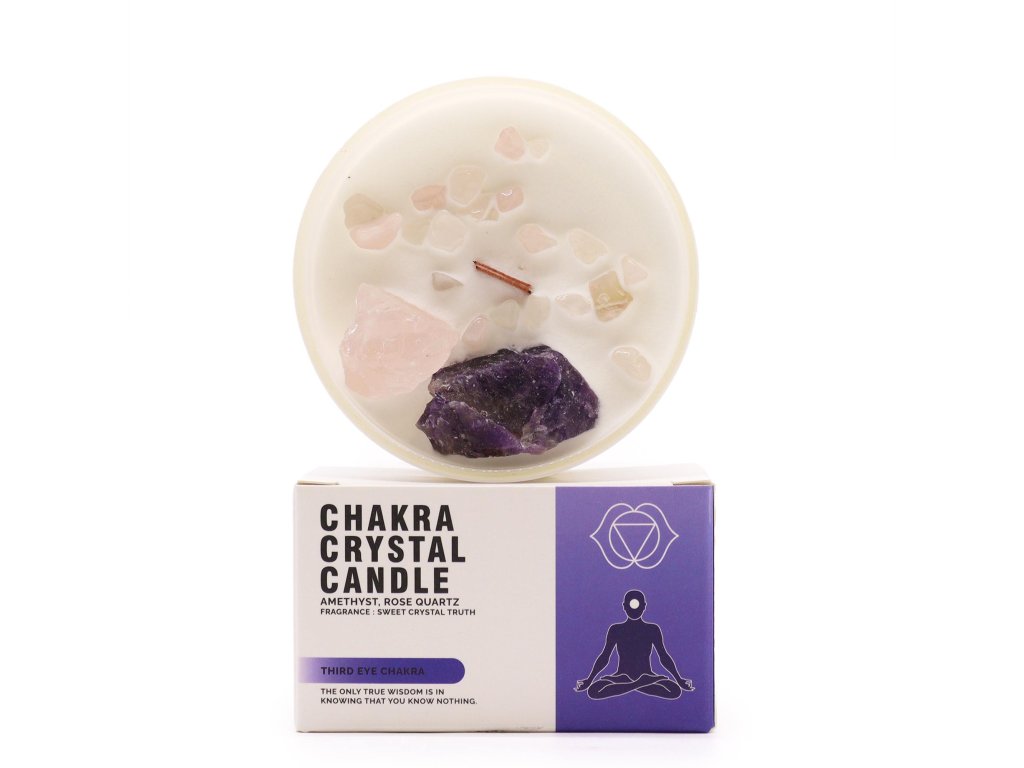 Zažijte sílu léčení s čakrovou křišťálovou svíčkou Third Eye Chakra od Ancient Wisdom, vytvořenou pro podporu duchovního vhledu a intuice.