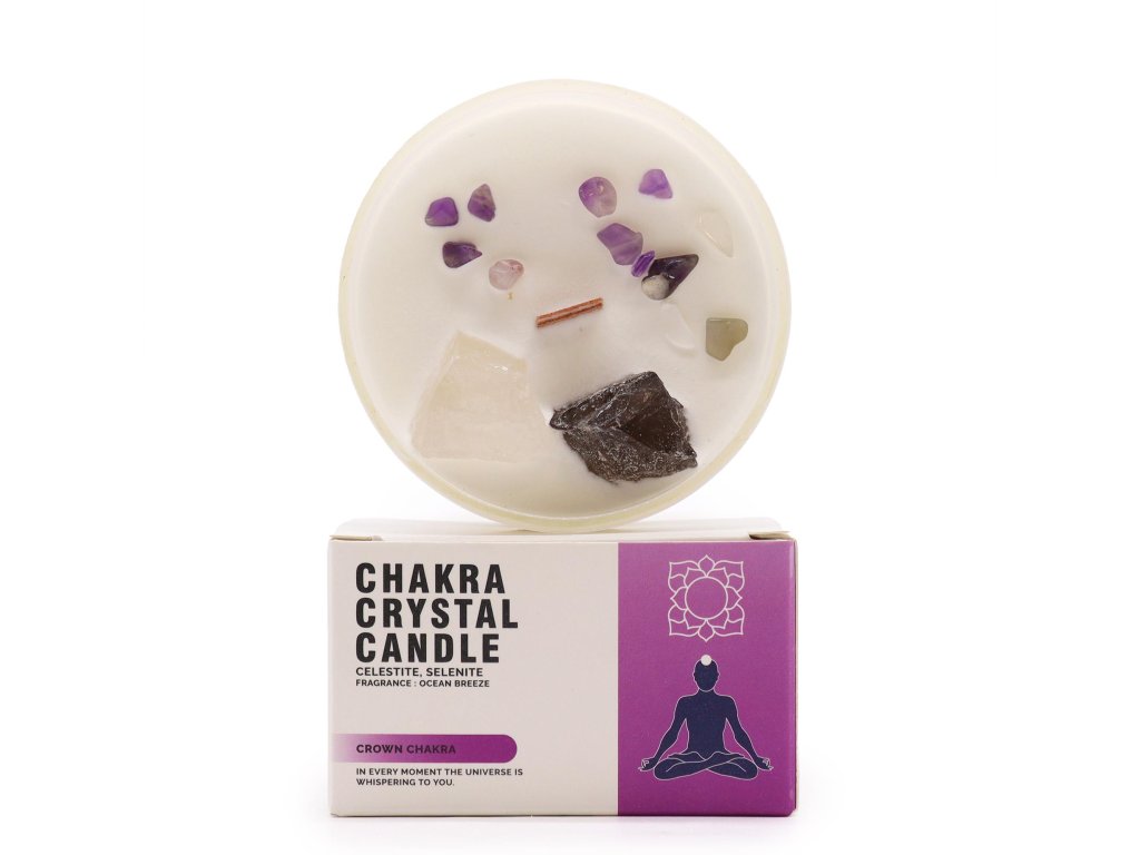 Chakra Crystal Candle Crown Chakra: sójová svíčka s celestitem a selenitem pro spojení s vyšším vědomím, duchovní klid a osvícení, s vůní oceánského vánku.
