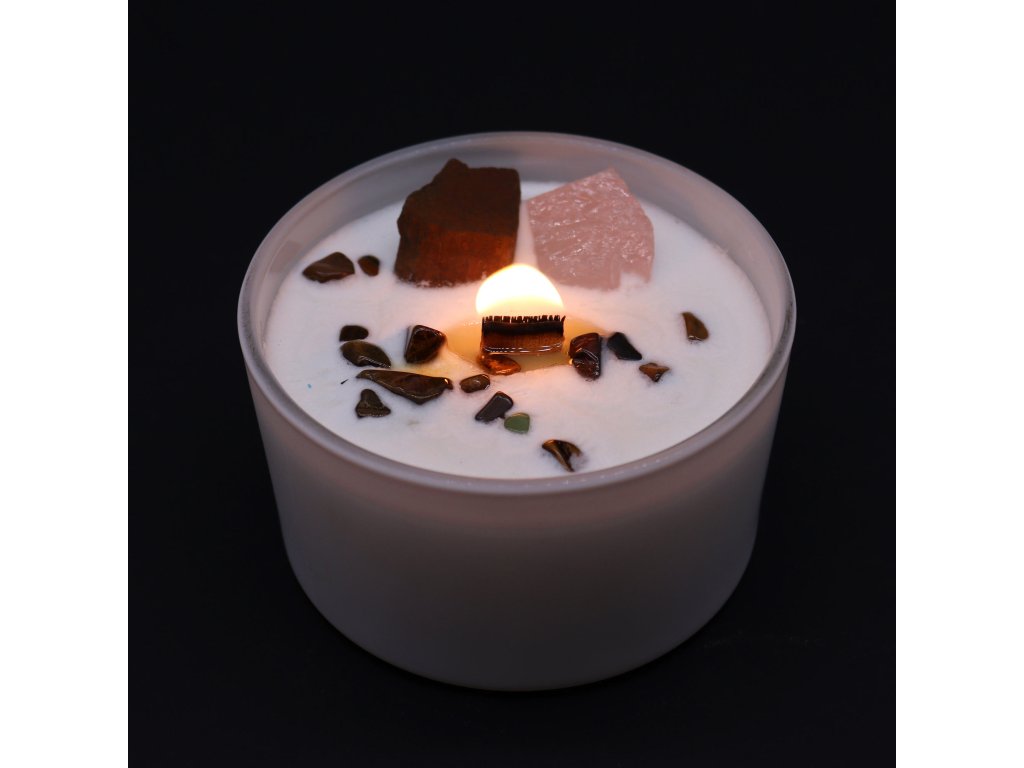 Každá svíčka je ručně vyrobena ze 100% přírodního sójového vosku a obohacena o léčivé kameny Tygřího oka a Růženínu, harmonizující sakrální čakru.
