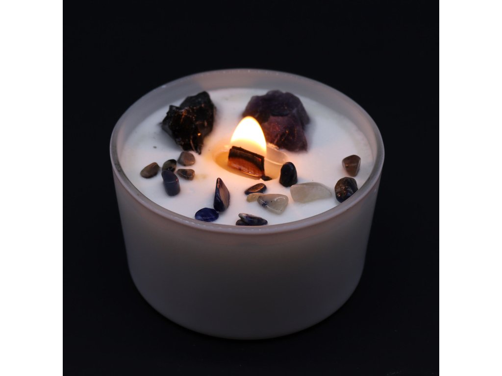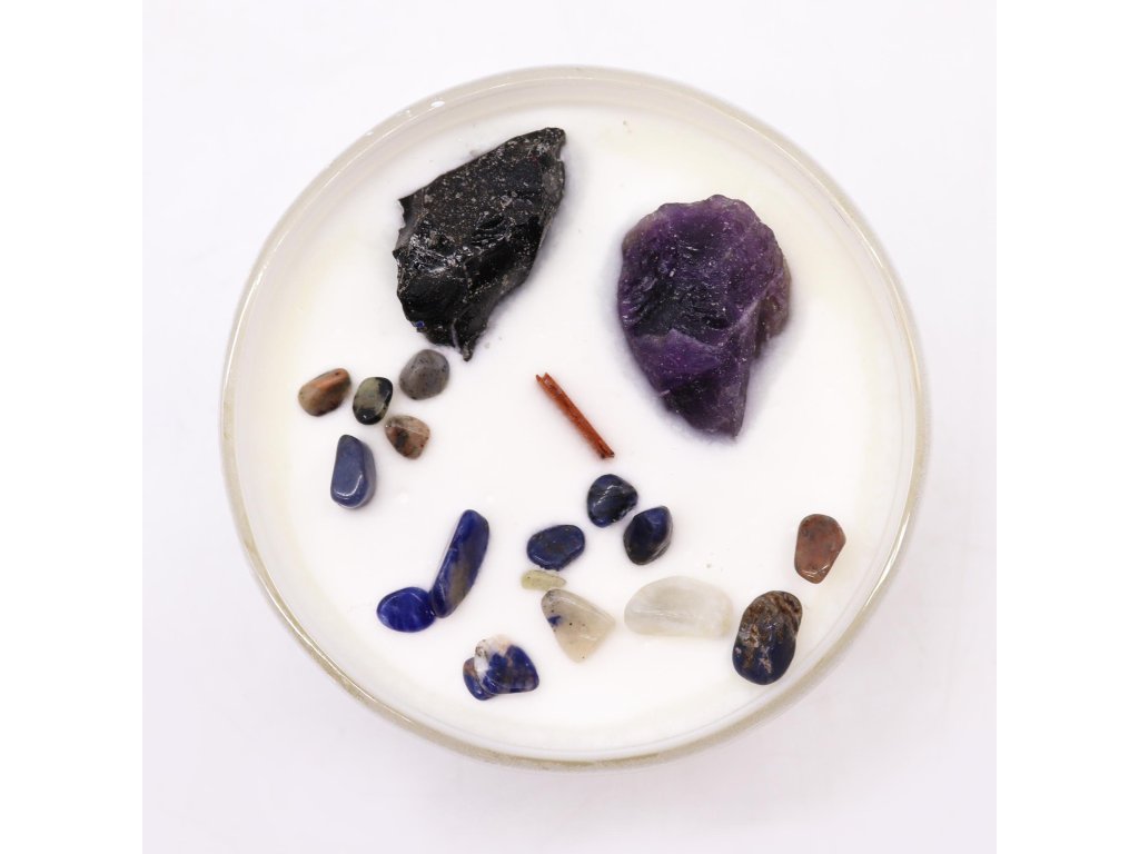 Svíčka je vyrobena ze 100% přírodního sójového vosku, obohacena o skutečné krystaly ametystu a černého achátu a nese dřevěné knoty pro maximálně příjemné hoření. Vůně "Deep in the Forest" s tóny bergamotu, kardamomu, jasmínu a ambry probouzí odvahu a vnitřní stabilitu.