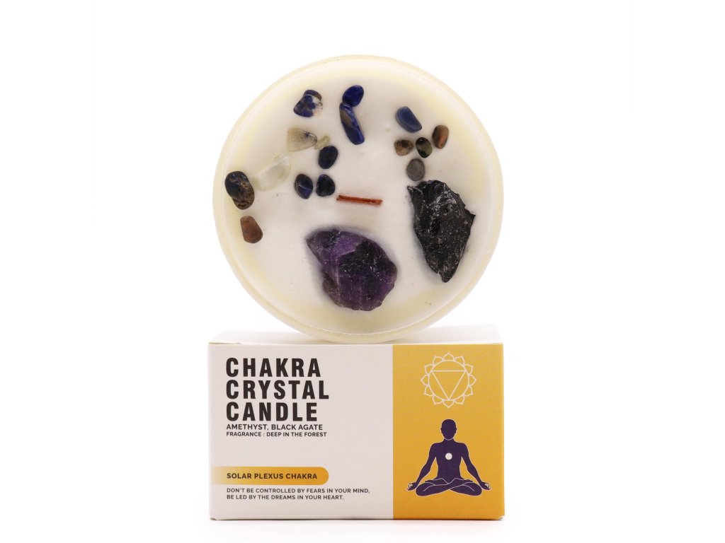 Chakra Crystal Candle Solar Plexus: sójová svíčka s ametystem a černým achátem pro posílení sebevědomí a vnitřní síly, s vůní Deep in the Forest.