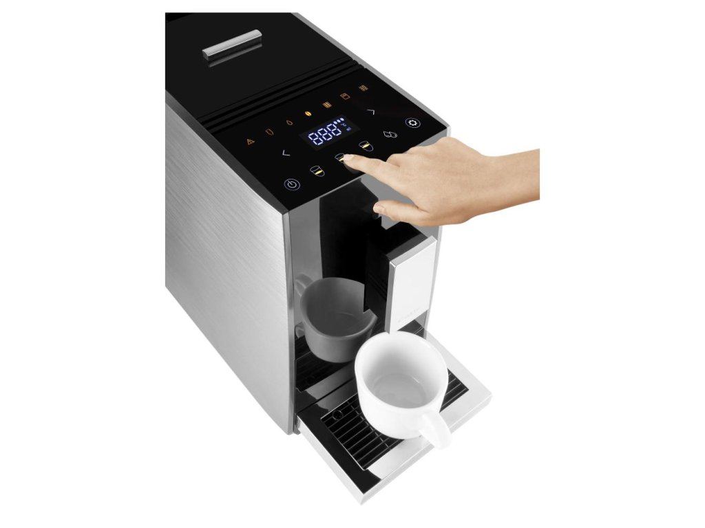 Kávovar je vybaven intuitivním dotykovým displejem, díky kterému si zvolíte nápoj jediným dotykem. Můžete připravit nejen espresso a lungo, ale také americano či horkou vodu na čaj. Kompaktní rozměry a hranatý design v kombinaci černé a nerezu se hodí do každé moderní kuchyně.