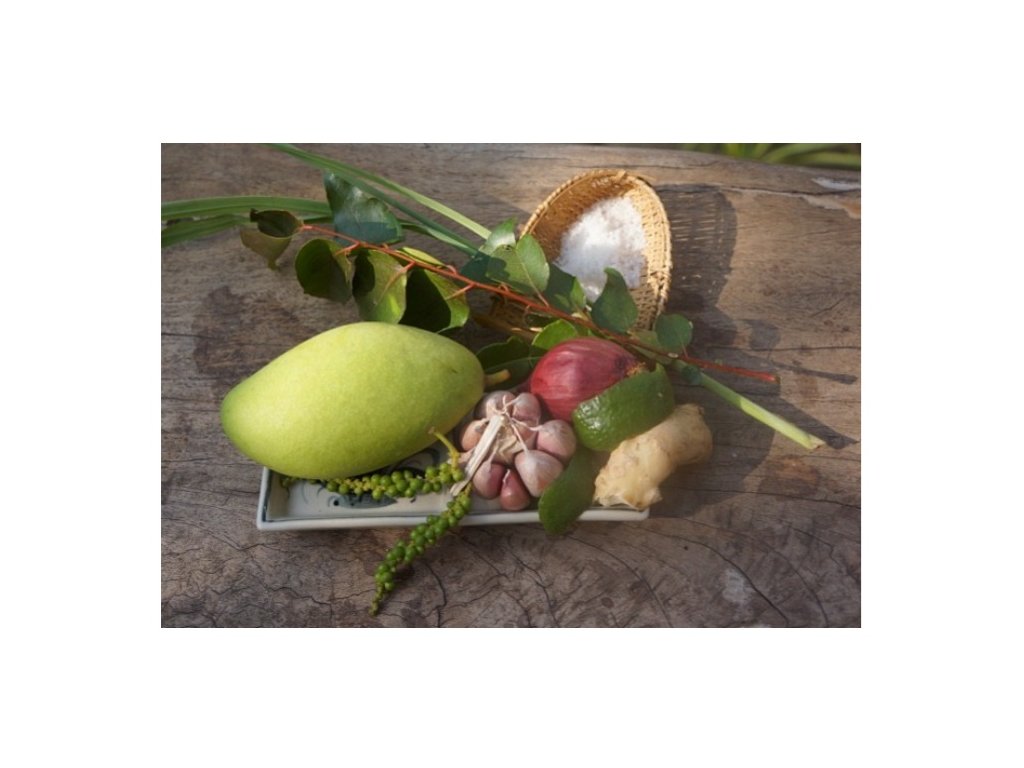 Dehydrovaný zelený Kampotský pepř doprovází svěží zázvor, česnek, kafrová limetka, zelené mango, kari lístky, šalotka, zauzená sůl a špetka palmového cukru. Výsledkem je dokonale vyvážená chuť, která předčí běžné grilovací směsi.