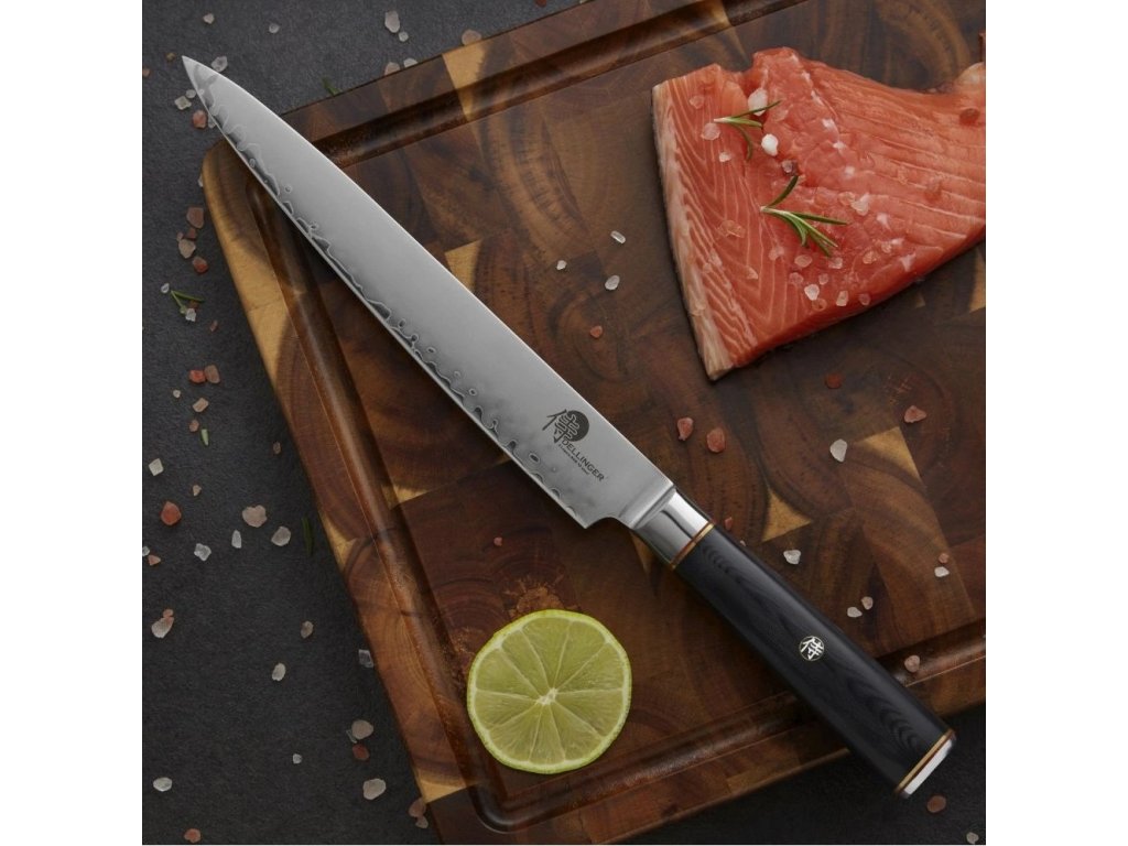 Šunkový nůž Dellinger Okami s čepelí z třívrstvé japonské oceli AUS-10 byl stvořen pro jediný účel: dokonalé krájení tenkých plátků – ať už pracujete se šunkou, roastbeefem, pečeným masem nebo připravujete delikátní carpaccio.