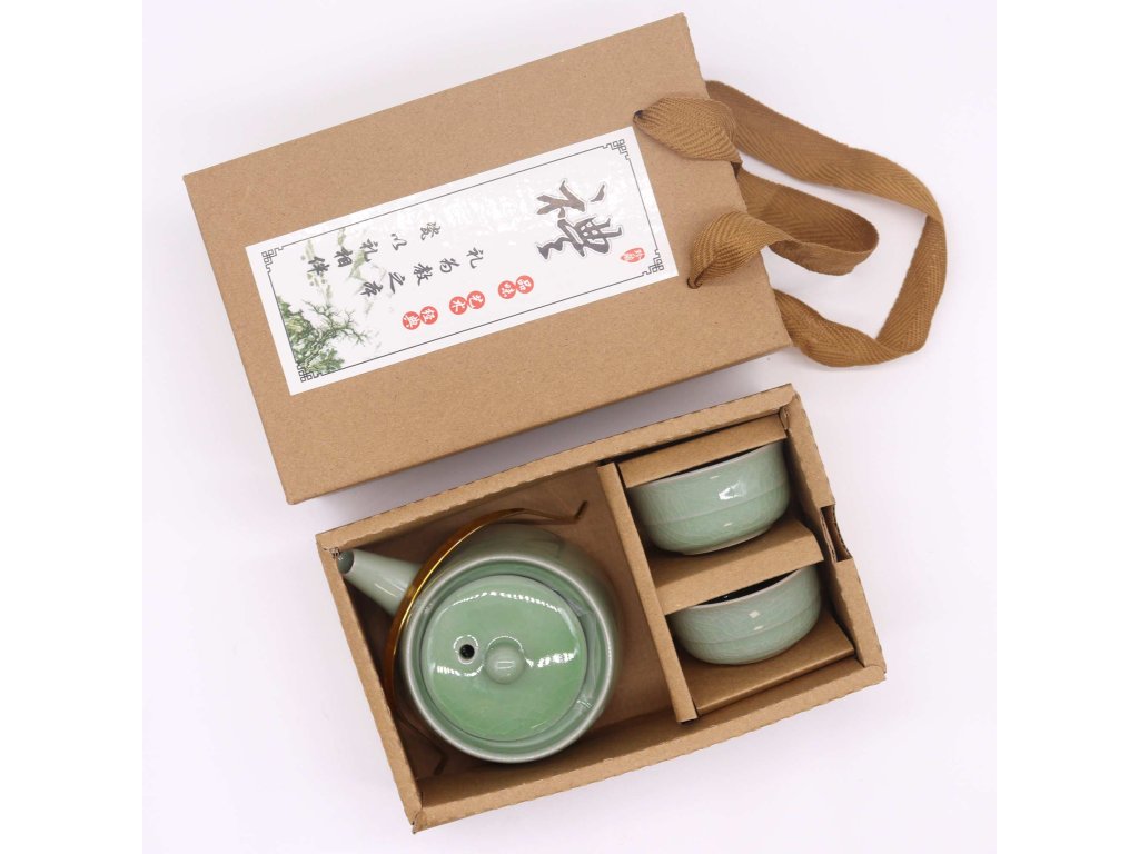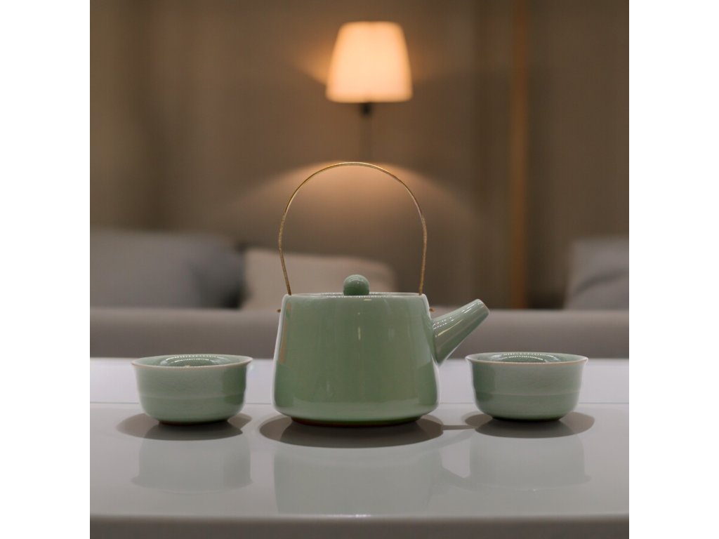 Keramická čajová souprava – Světle zelená, krakelovaná glazura, konvička a 2 šálky,