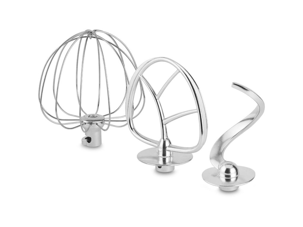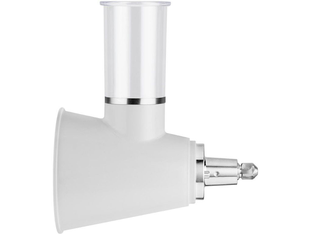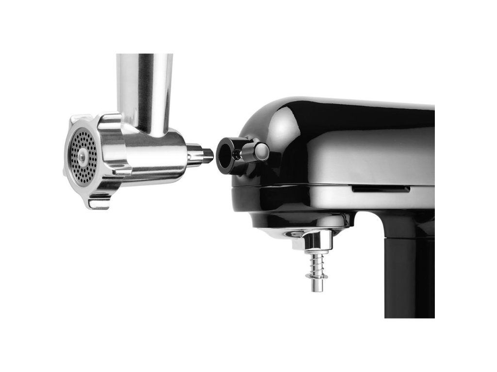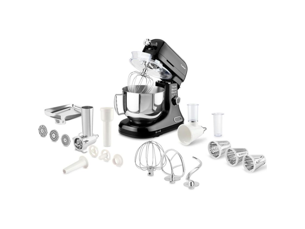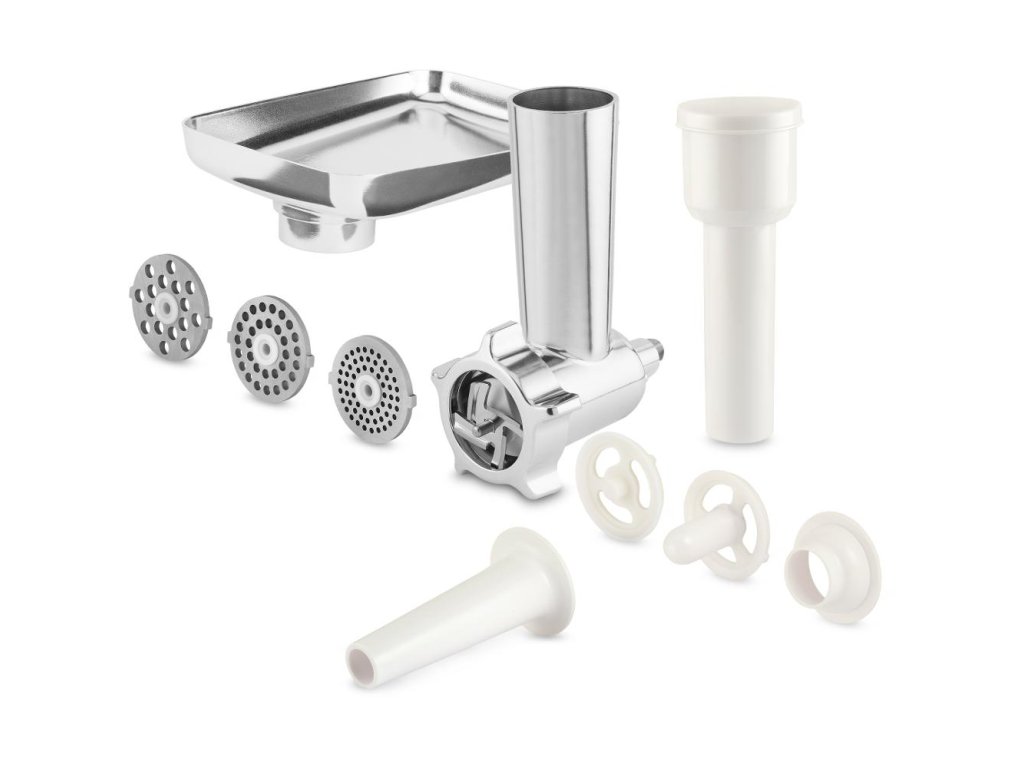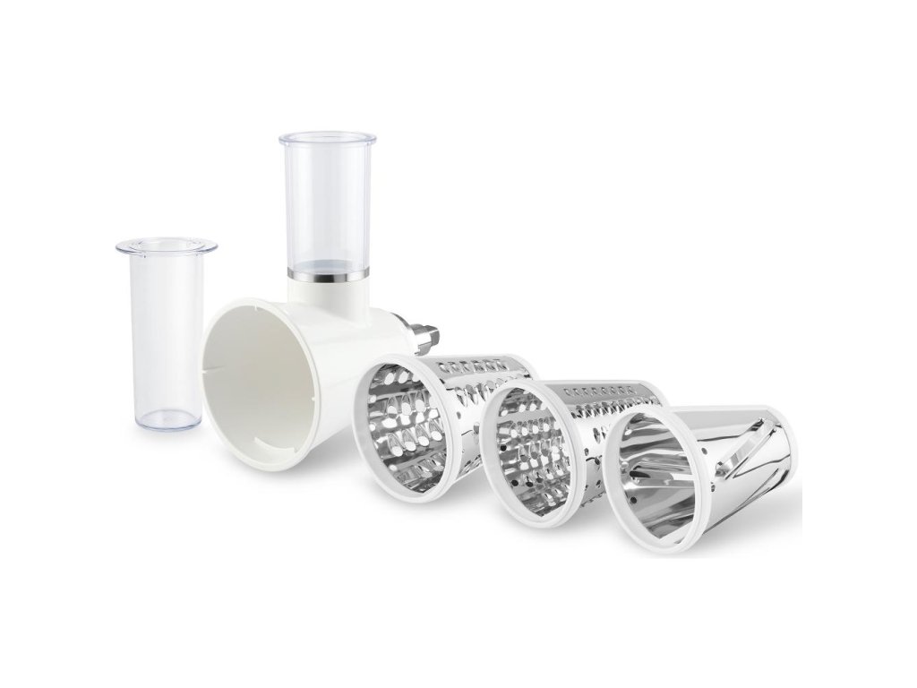 Příslušenství: Mlýnek na maso, nástavec na uzeniny, 3× struhadlo, hnětací hák, plochá a balonová metla