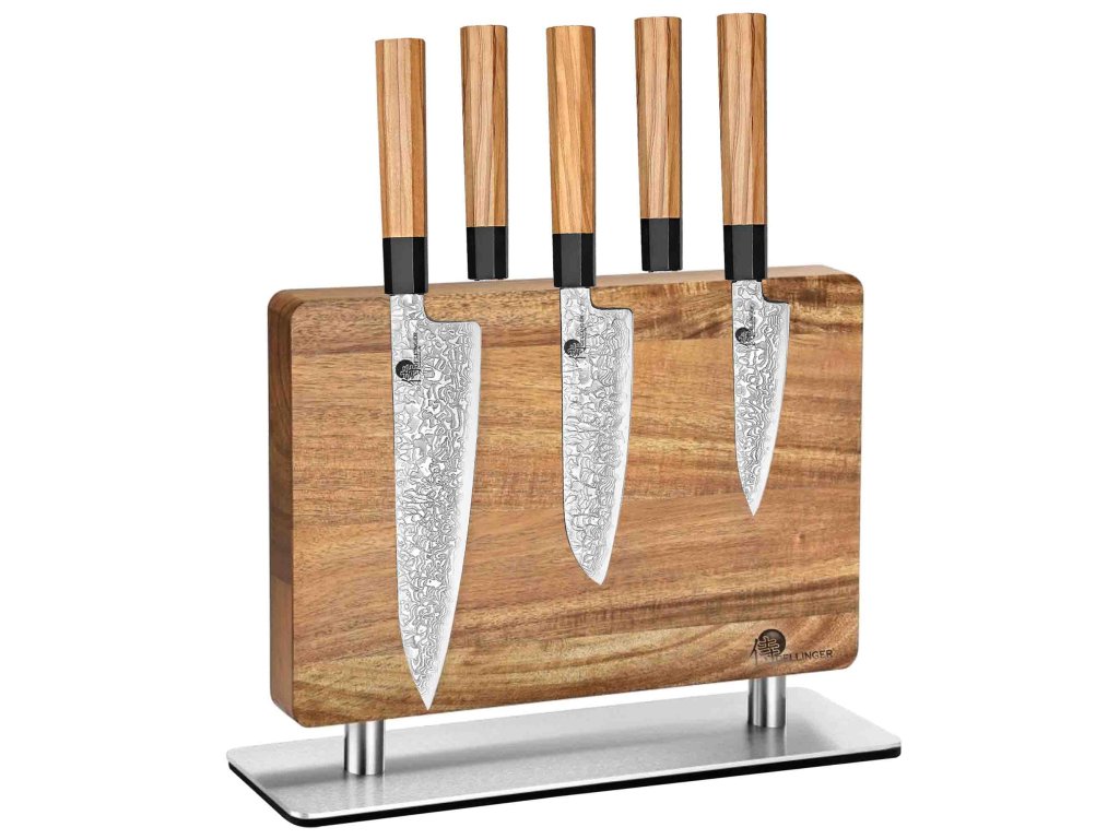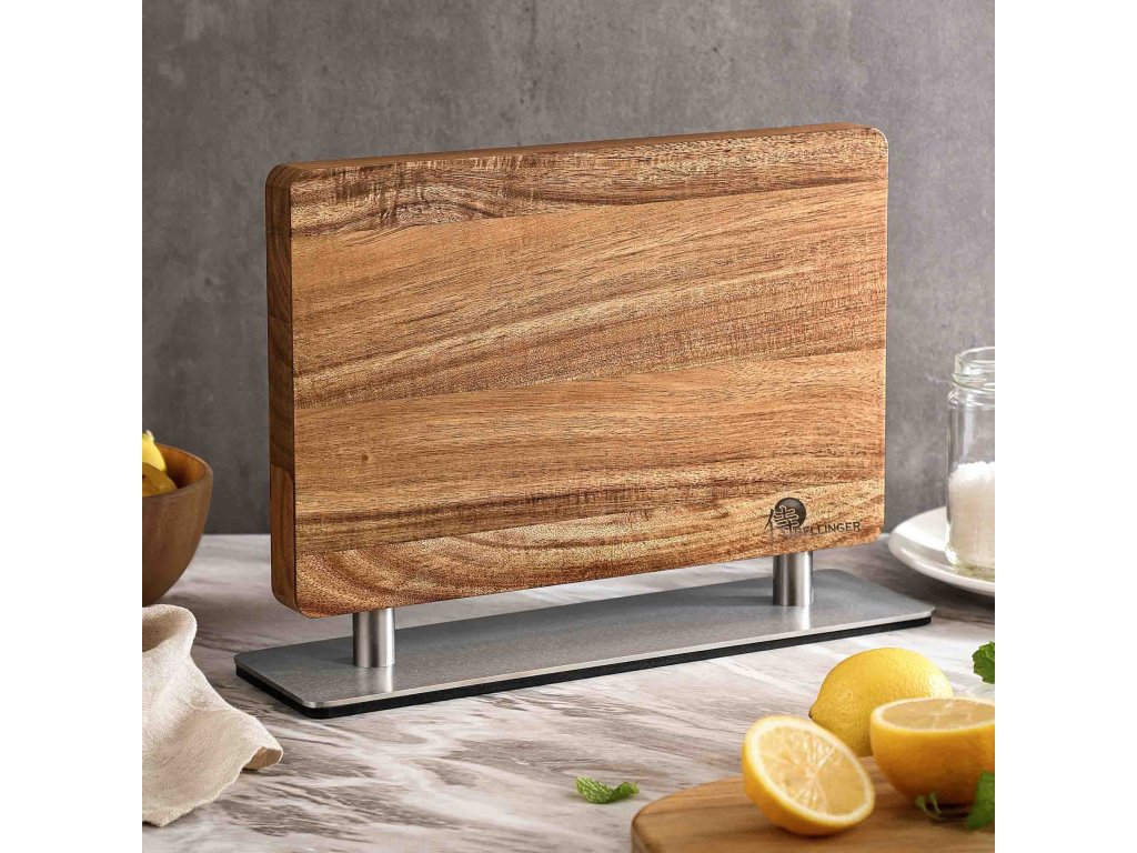 Tento masivní magnetický držák na nože je víc než jen kuchyňský doplněk. Je to designový prvek, který kombinuje přírodní akáciové dřevo s pevnou nerezovou základnou, a vytváří tak dokonalý způsob, jak bezpečně a elegantně vystavit své oblíbené nože.
