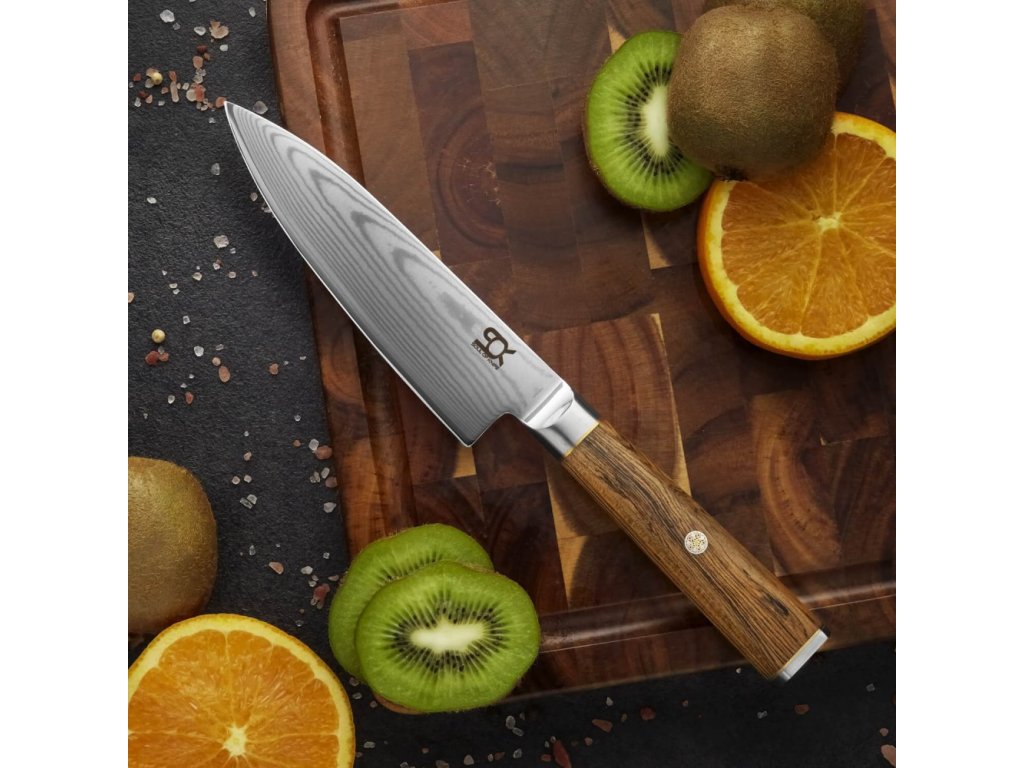Tenhle kratší Gyuto od značky SOK je nůž, který ti v kuchyni nahradí skoro vše – je obratný, ostrý, krásně padne do ruky a díky čepeli z damaškové oceli a rukojeti z cocobola i nádherně vypadá.