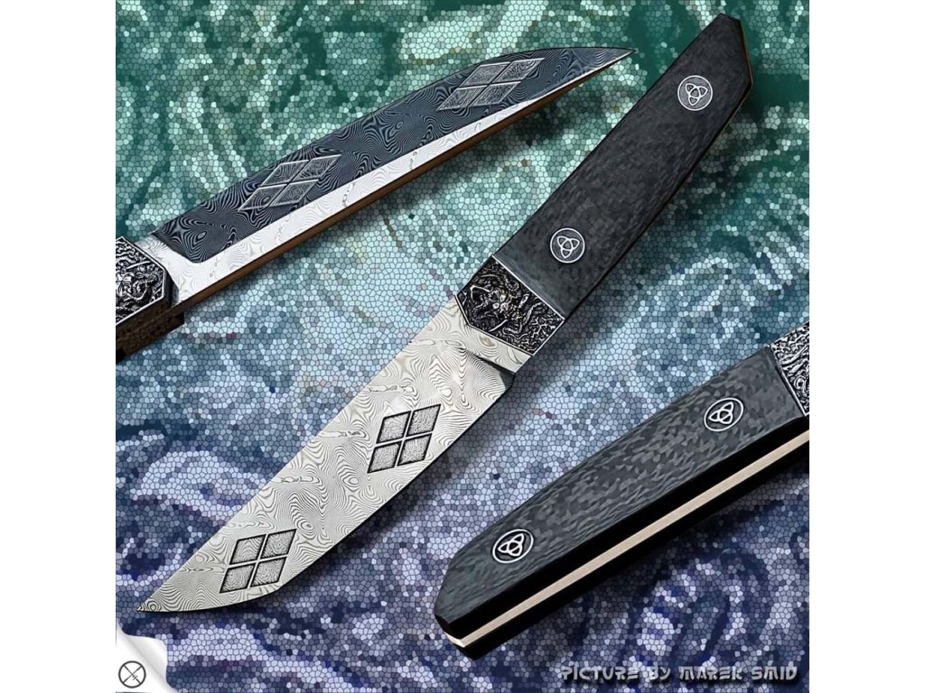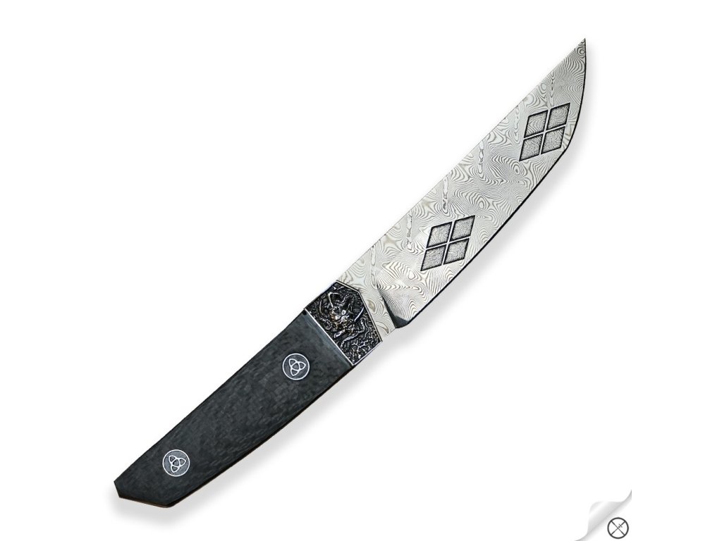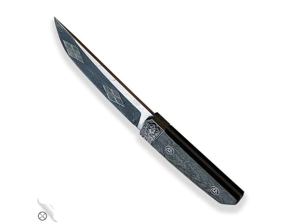Klasická tanto čepel evokuje japonské meče – s důrazem na průraznost, přesnost a pevnost hrotu. Saténový povrch s hlubokým gravírováním dodává noži syrovou krásu a výraz.
