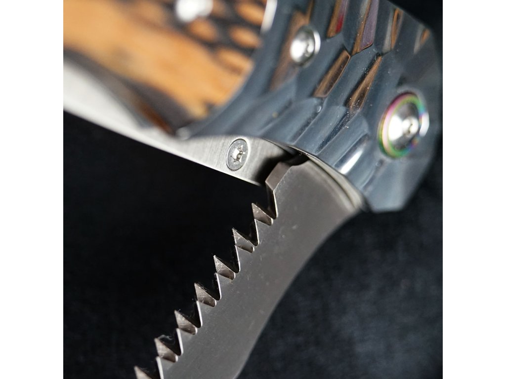 Druhá čepel – pilka – je praktickým nástrojem pro úpravu větví, přípravu třísek, stavbu přístřešku nebo řešení nečekané situace. Obojí je zajištěno liner lock pojistkou, každá čepel zvlášť, pro bezpečné a kontrolované použití.