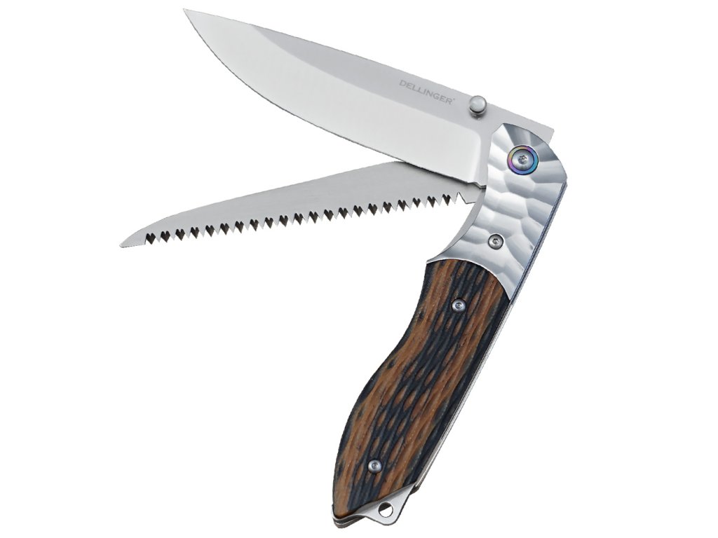 Outdoor. Les. Nouze. Táboření. Práce i přežití. Dellinger Wilderer je zavírací nůž navržený tak, aby ti nabídl dvojnásobnou užitečnost v jednom těle. Klasická čepel a ostrá pilka ti dají nástroje, které potřebuješ – v kapse, v batohu i na opasku.