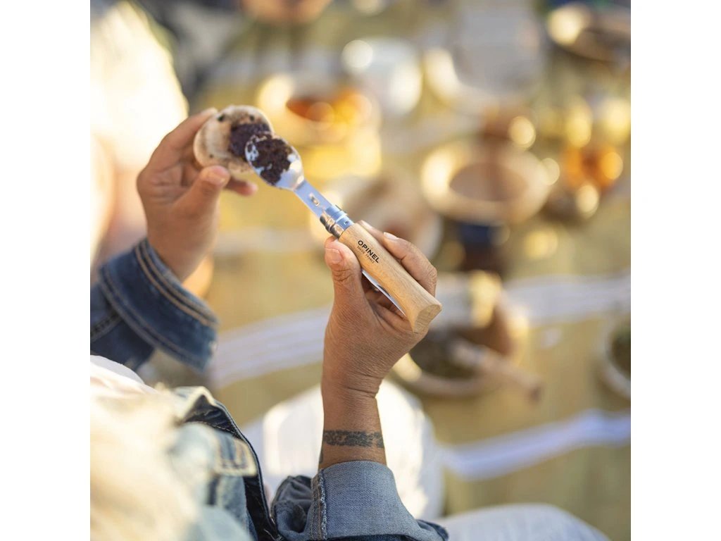 Základem sady je legendární zavírací nůž Opinel N°08, který slouží nejen jako nůž, ale také jako rukojeť pro příborové nástavce. Stačí otevřít otočný kroužek Viroblock, připevnit lžíci nebo vidličku pomocí malých zářezů a znovu kroužek uzavřít – během několika sekund máte plnohodnotný příbor.