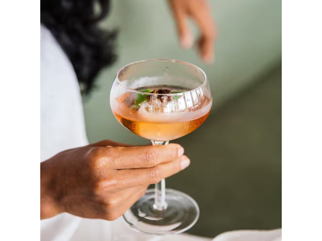 Postup: Protřepejte s ledem, dvakrát přeceďte do kupety a ozdobte limetkovým listem nebo kůrou.