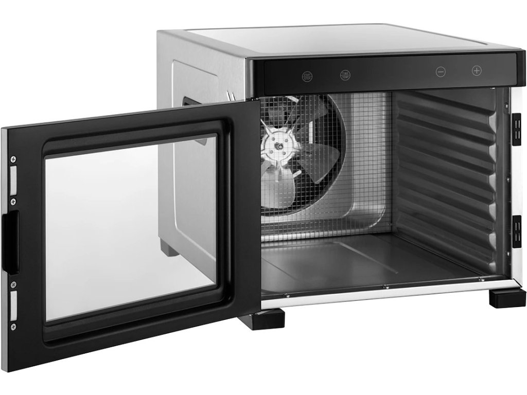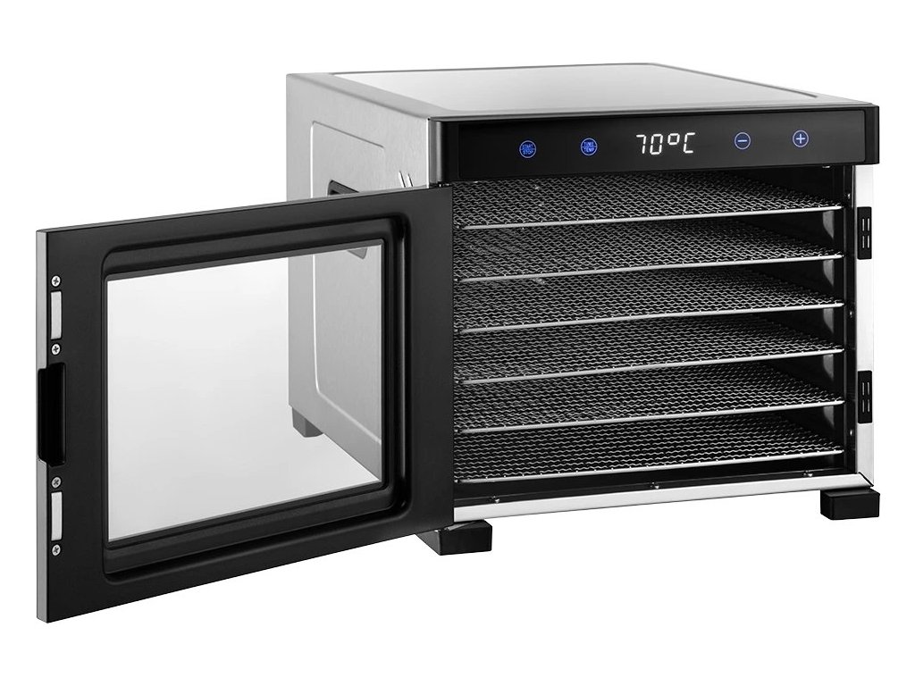 Součástí balení jsou také 2 RAW tácky vhodné na přípravu ovocné kůže, krekrů či tyčinek. Teplotu nastavíte plynule od 35 do 70 °C pomocí digitálního dotykového displeje. Časovač umožňuje nastavení od 30 minut do 24 hodin a po skončení programu se sušička automaticky vypne. Bezpečnostní pojistka chrání proti přehřátí a všechna plata lze pohodlně mýt v myčce nádobí.